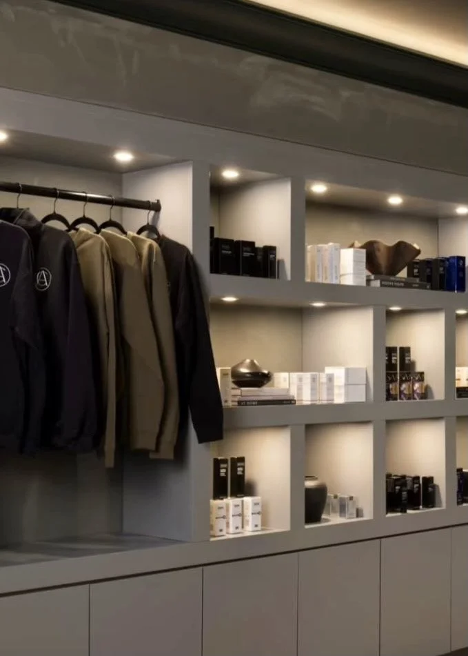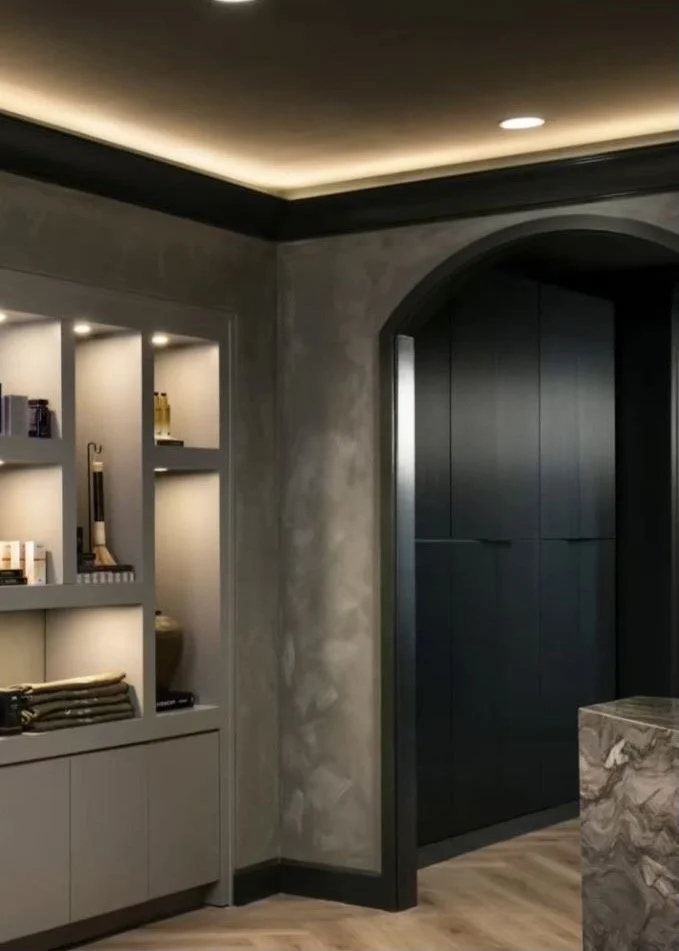 We partnered with the HDC design team to create an elevated aesthetics clinic, with deep-toned walls and dramatic lighting. Natural wood flooring introduces warmth and texture, while statement lighting and sculptural archways adds depth and refinement to the space.